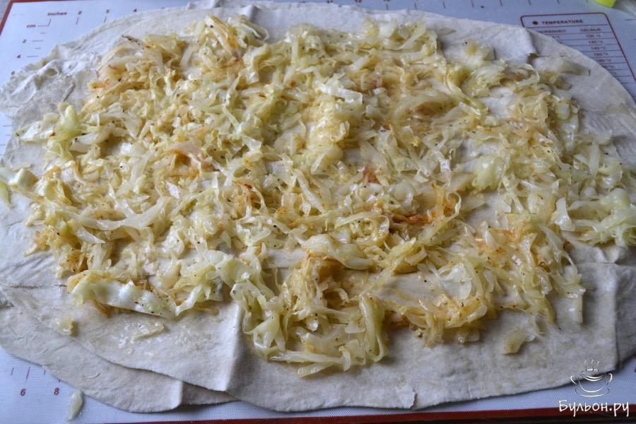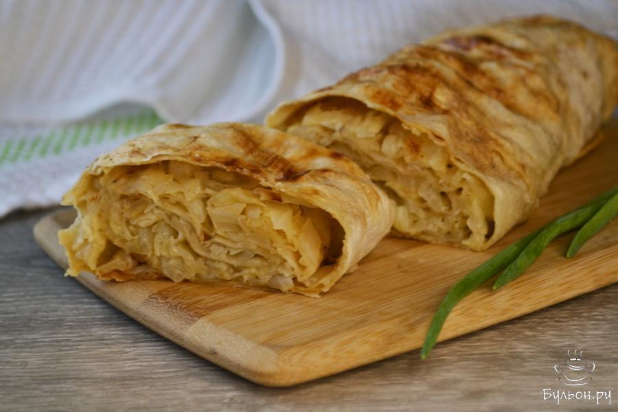 Из тонкого лаваша можно приготовить очень много самых разных блюд, как сладких, так и более сытных. Рулет из лаваша с тушеной белокочанной капустой получается очень вкусный, ароматный, сытный, сочный. Для мягкости и придания сливочного вкуса верх рулета нужно смазать сметаной. В тушеную капусту можно положить любимые специи и приправы. Мягкий лаваш можно без труда свернуть в рулет, а если лаваш подсох, как у меня, можно немного смазать его поверхность растительным или сливочным маслом.