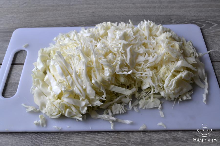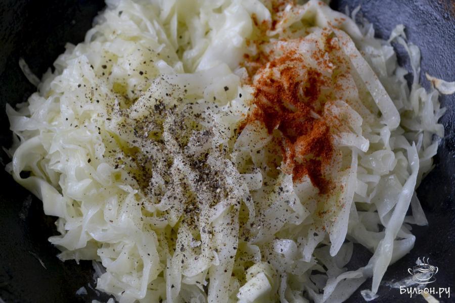 2. Разогреть сковороду с растительным маслом и тушить капусту на среднем огне до мягкости. В конце тушения положить соль, черный молотый перец и паприку сладкую или те специи, которые вам по вкусу.