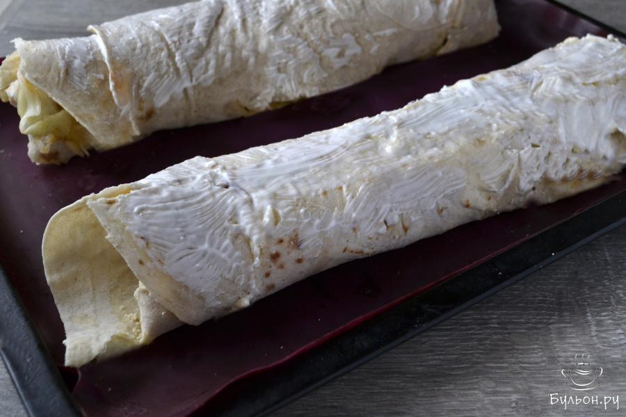 6. Переложить рулет на противень, застеленный силиконовым ковриком или пекарской бумагой. Смазать рулет сметаной.