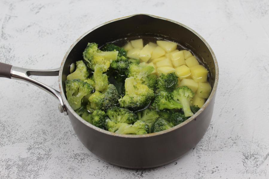 3. В ковшик влить воду, выложить кубики картофеля и соцветия замороженной брокколи, посолить и довести до кипения. После закипания варить суп в течение 10 минут, на среднем огне.