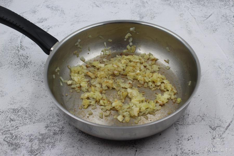 4. Пока варятся овощи, приготовить поджарку. На сливочном масле слегка обжарить лук с чесноком, пока не появится характерный аромат.