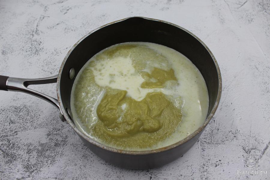 7. В получившийся суп-пюре влить молоко, перемешать и довести до кипения. Как только на поверхности появятся первые пузырьки, снять кастрюлю с огня, посолить, поперчить и перемешать.