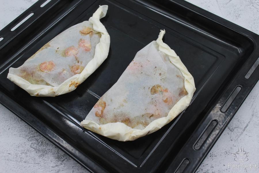 6. Получившиеся конверты выложить на противень и запекать в разогретой до 180 градусов духовке, в течение 15-20 минут. Во время запекания конверты вздуются и немного потемнеют.