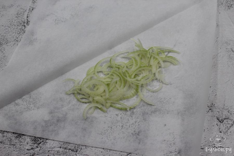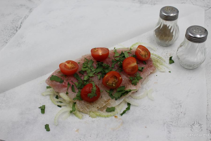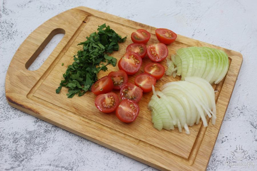 1. Одну маленькую луковицу нарезать тонкими полукольцами, помидоры черри разделить пополам, зелень мелко порубить.