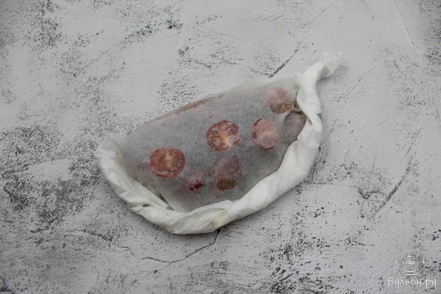 5. Закрыть половину пергамента с рыбой, второй половиной свободного пергамента и завернуть край по принципу вареника.
