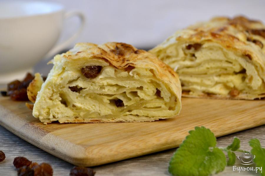 7. Испеченный рулет снять с противня, немного охладить, отрезать неровные концы. Нарезать на кусочки и подать к чаю. Очень нежная, сладкая творожная начинка с изюмом и мягкий лаваш - как же это вкусно с чашечкой свежего чая! Приятного аппетита!