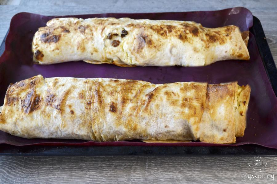 5. Свернуть лаваш в плотный рулет, переложить на противень с силиконовым ковриком и смазать сметаной или сливочным маслом.