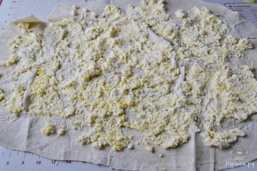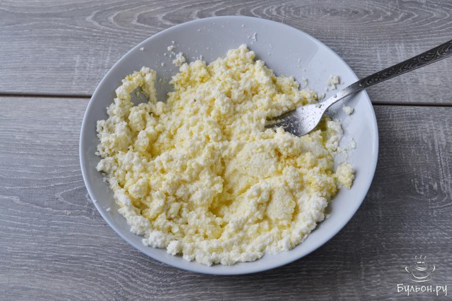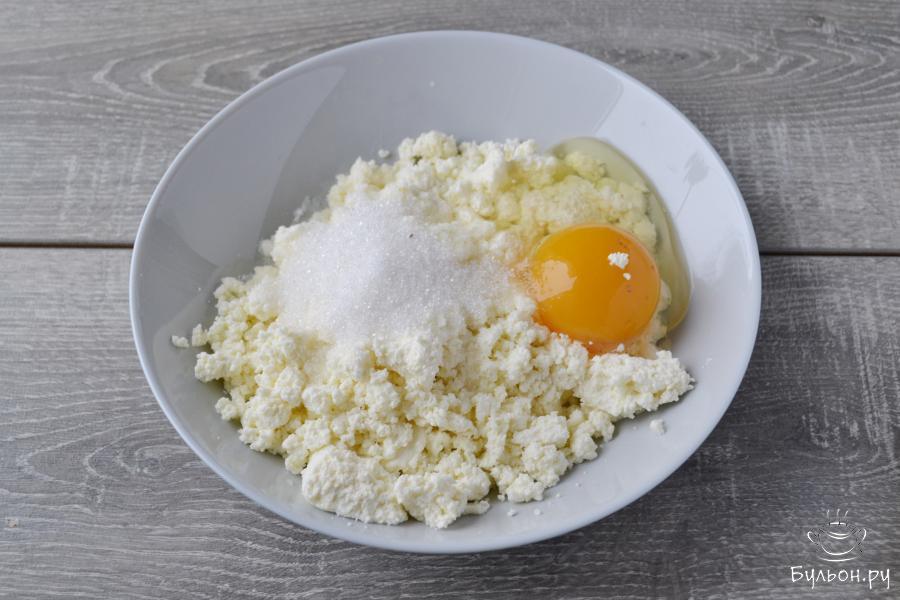 1. Для начинки нужно соединить в миске творог, сахар и яйцо. По желанию можно добавить ванильный сахар.