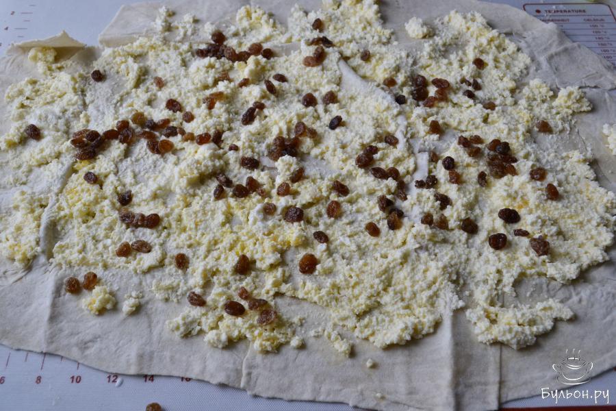 4. На творог положить промытый изюм. Если изюм очень сухой, то заранее залить его теплой водой на 10-15 минут, затем воду слить и изюм обсушить.