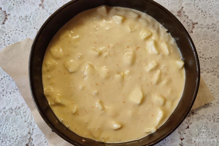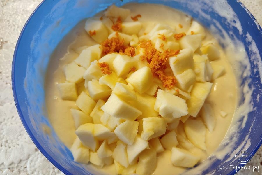 4. Яблоки очистить от кожуры и семян. Нарезать средними кубиками, добавить в тесто вместе с цедрой апельсина.