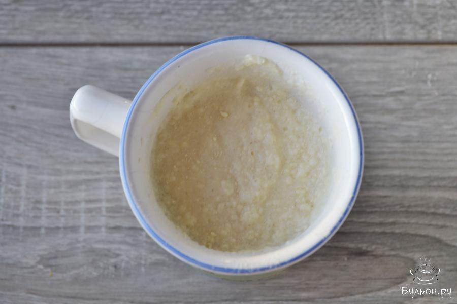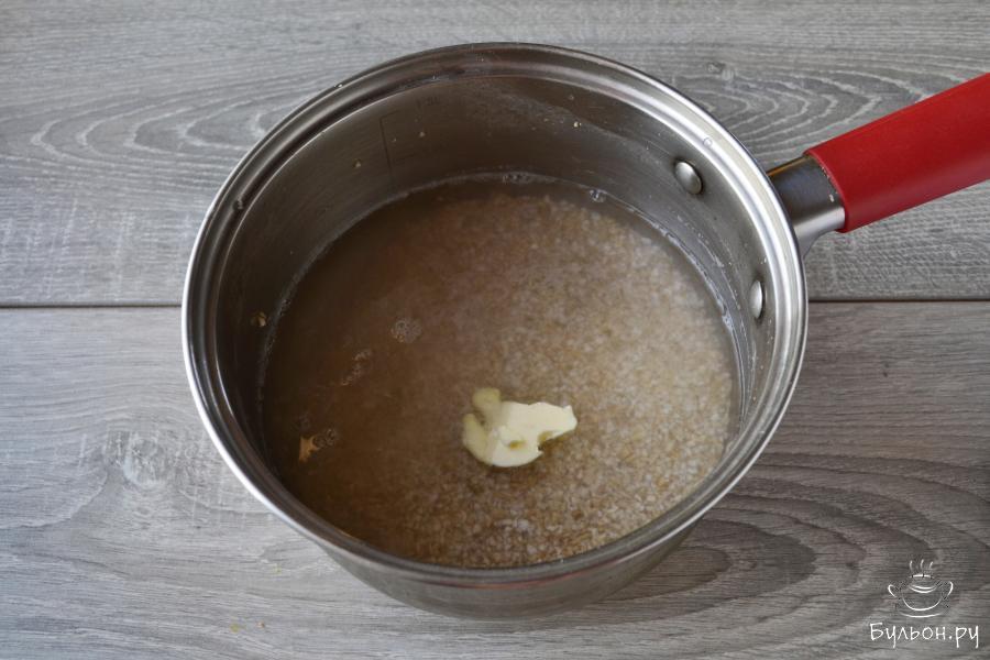 2. Влить горячую воду (2 стакана), положить кусочек сливочного масла (1ч. л.) и всыпать щепотку соли.