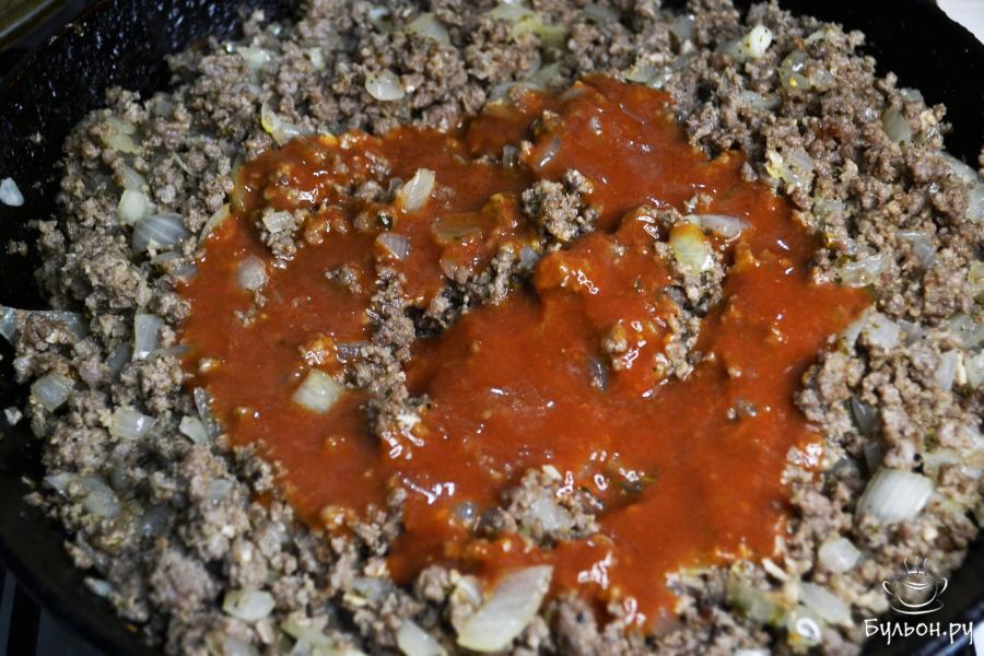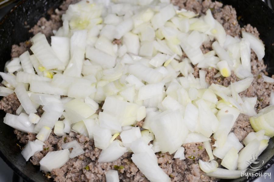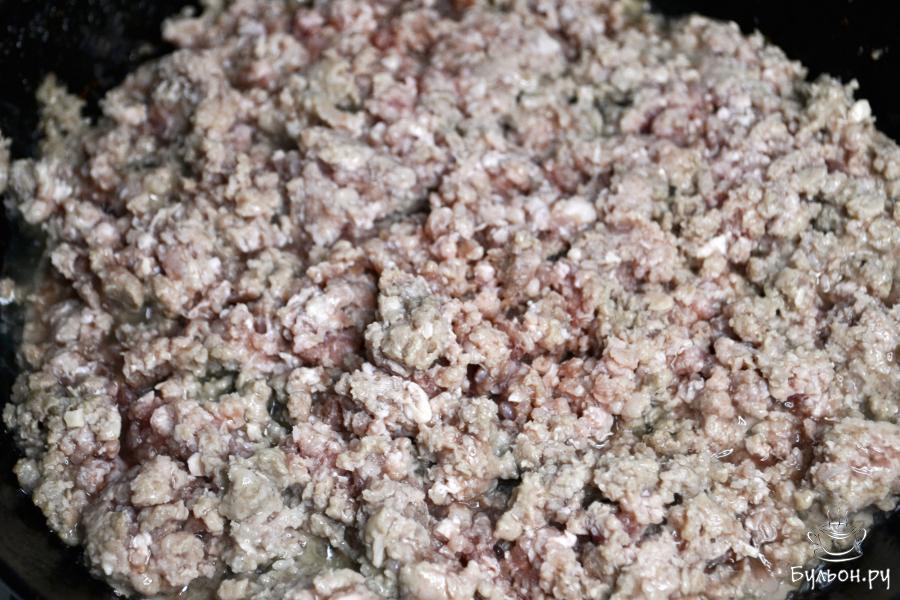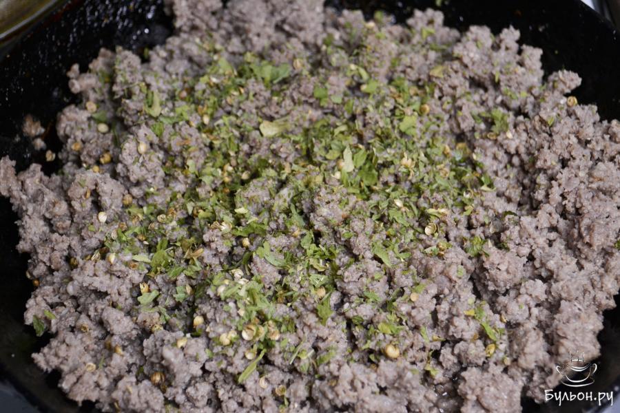 2. На среднем огне обжарить фарш, помешивая, до испарения жидкости. Во время обжаривания фарша, добавить сушеную зелень и специи по вкусу, посолить.