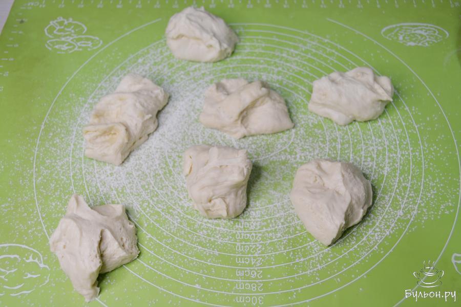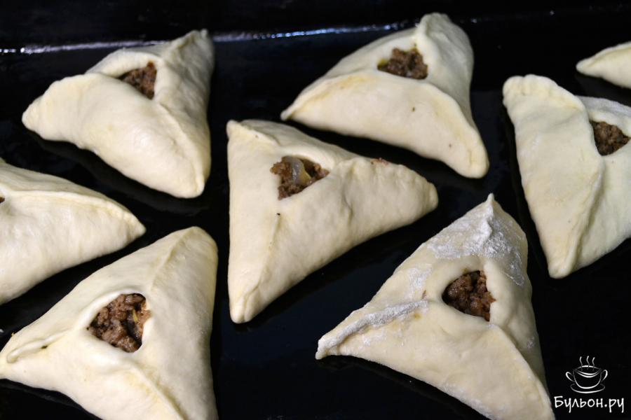 8. Соединить тесто вверху над начинкой, сформировав треугольник. В центре оставить небольшое отверстие.