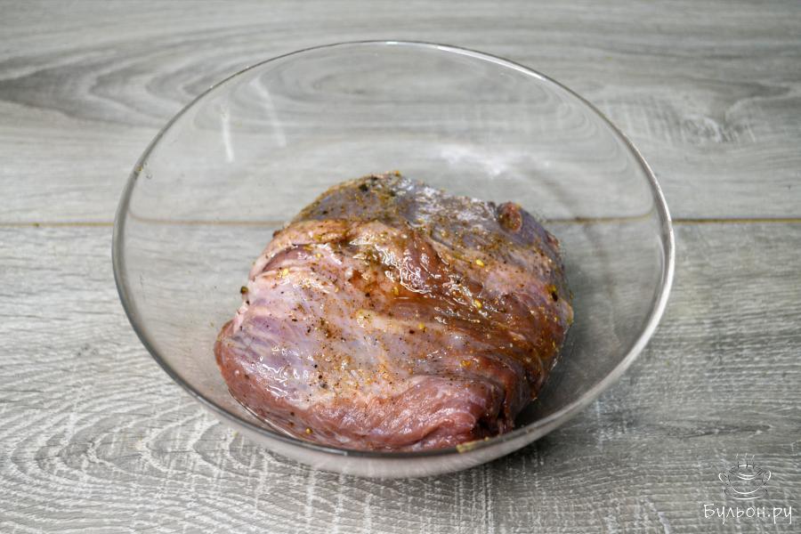 4. Затем переложить мясо в удобную посуду, добавить растительное масло и втереть его со всех сторон в говядину. Оставить мясо на несколько часов, можно на всю ночь, чтобы оно хорошо пропиталось специями и солью.