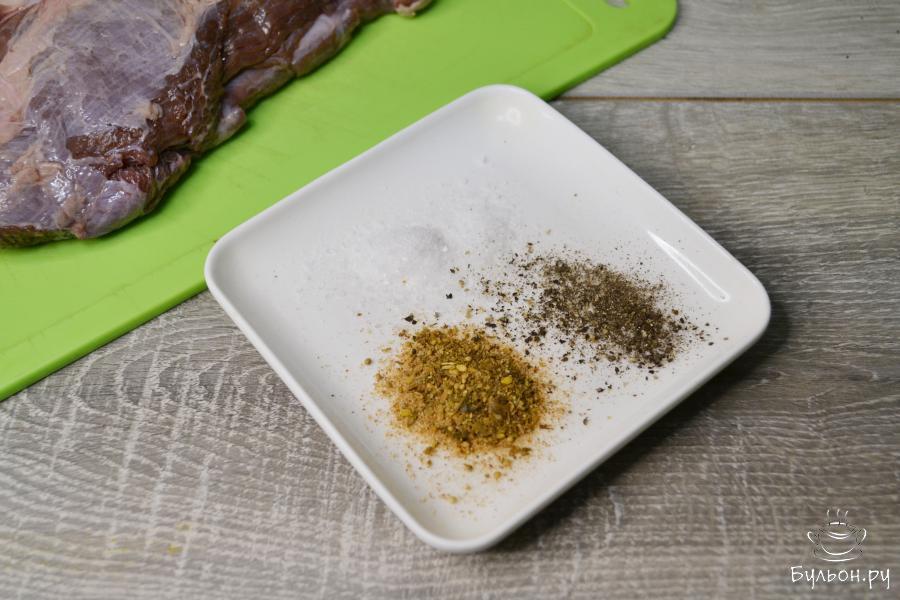 2. Для маринования мяса можно взять любые специи, которые вам по вкусу. В данном рецепте используется соль, черный молотый перец и универсальная приправа для говядины, купленная в магазине.