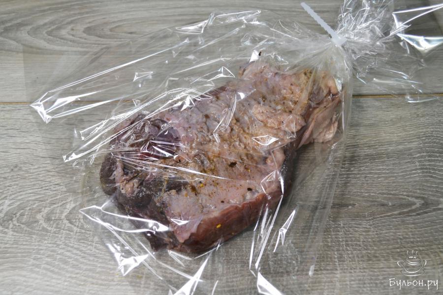 5. Переложить мясо в рукав для запекания, завязать его, сделать прокол ножом, для выхода пара во время приготовления. Положить на противень, поставить для запекания в духовку, заранее разогретую до 180 градусов.