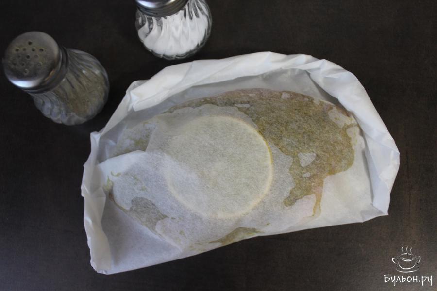 5. Накрыть рыбу второй половиной пергамента и свернуть край так, чтобы получился хорошо завернутый кулек, как на фотографии.