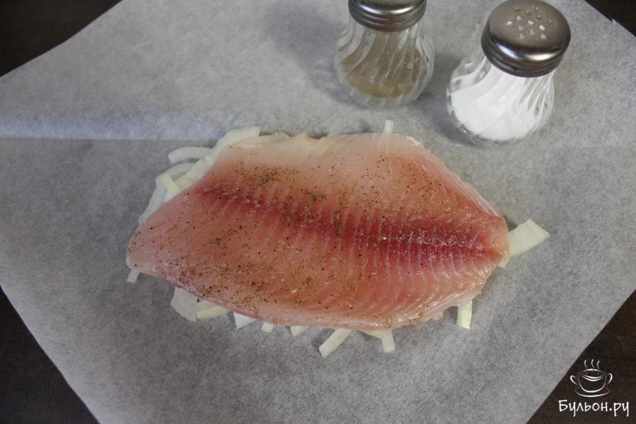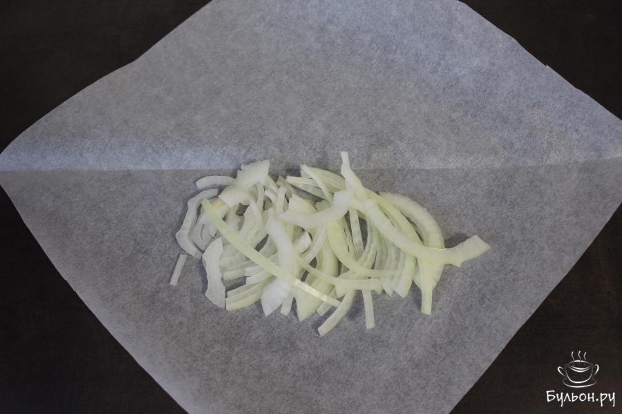 1. Квадрат пергамента сложить пополам, по диагонали. Раскрыть и на одну половину, ближе к центру, выложить полукольца очищенного репчатого лука.
