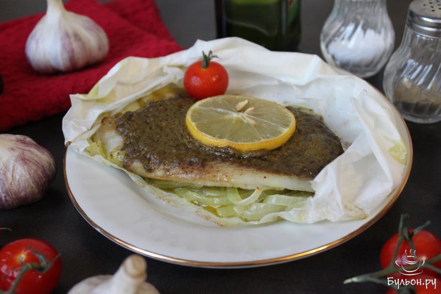 7. Готовую рыбу переложить на тарелку в пергаменте. Аккуратно срезать верхнюю часть пергамента и подать на стол в горячем виде.