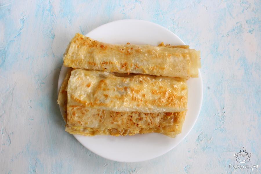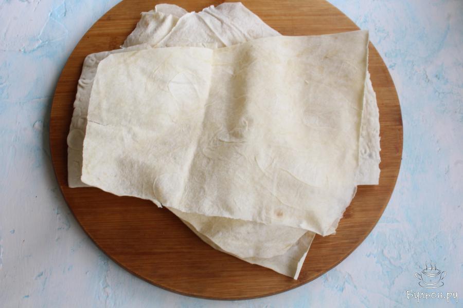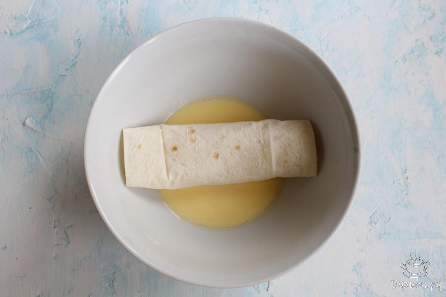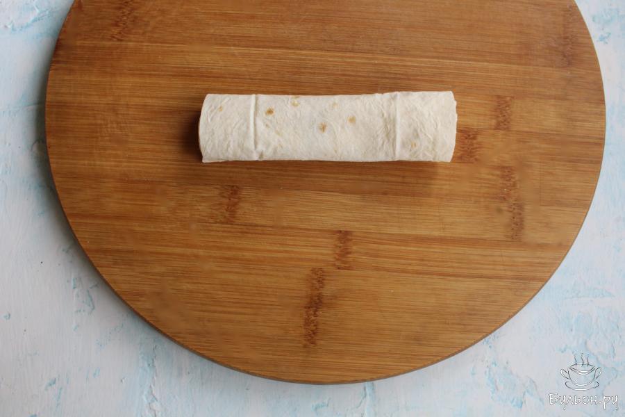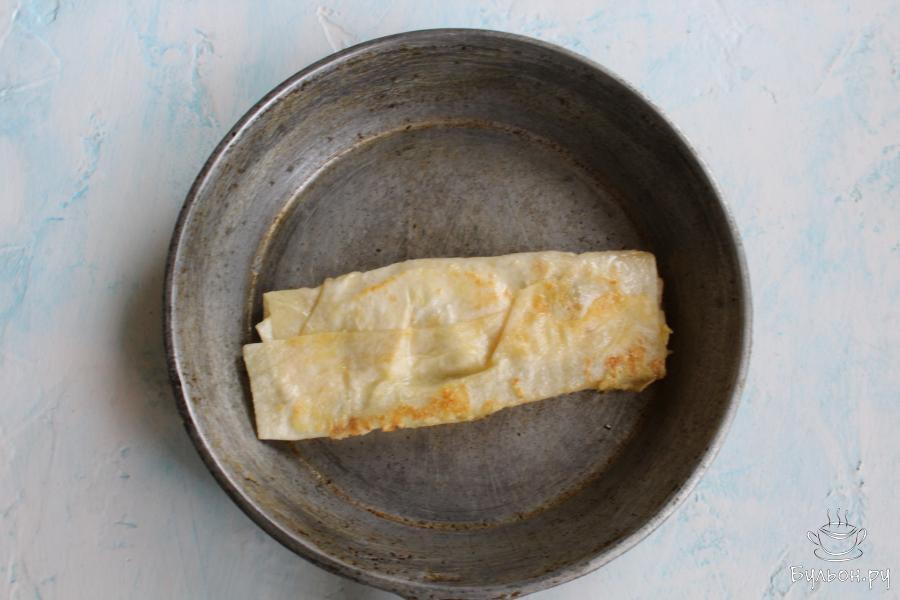 6. Выложить трубочку из лаваша над кляром так, чтобы он не размок и кисточкой смазать всю трубочку кляром.