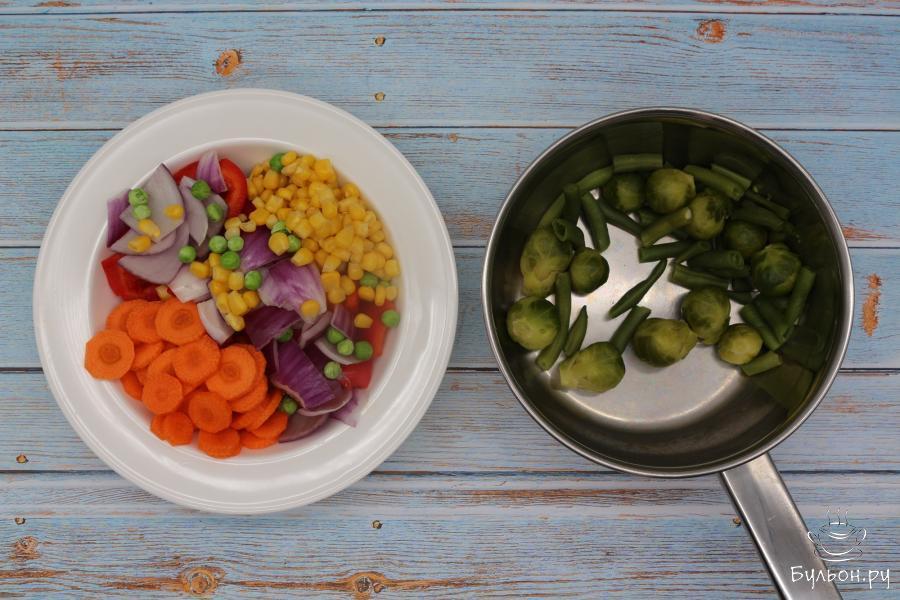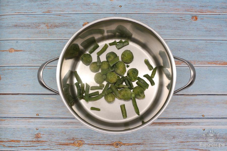 1. Капусту брюссельскую и фасоль стручковую выложить в кастрюлю, залить водой и поставить на огонь. Довести до кипения, проварить 3 минуты, после откинуть на дуршлаг.