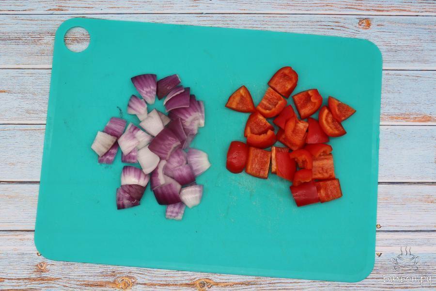 4. К овощам добавить соль, черный перец и паприку. Влить пару ложек оливкового масла, все хорошо перемешать и выложить в форму для запекания.
