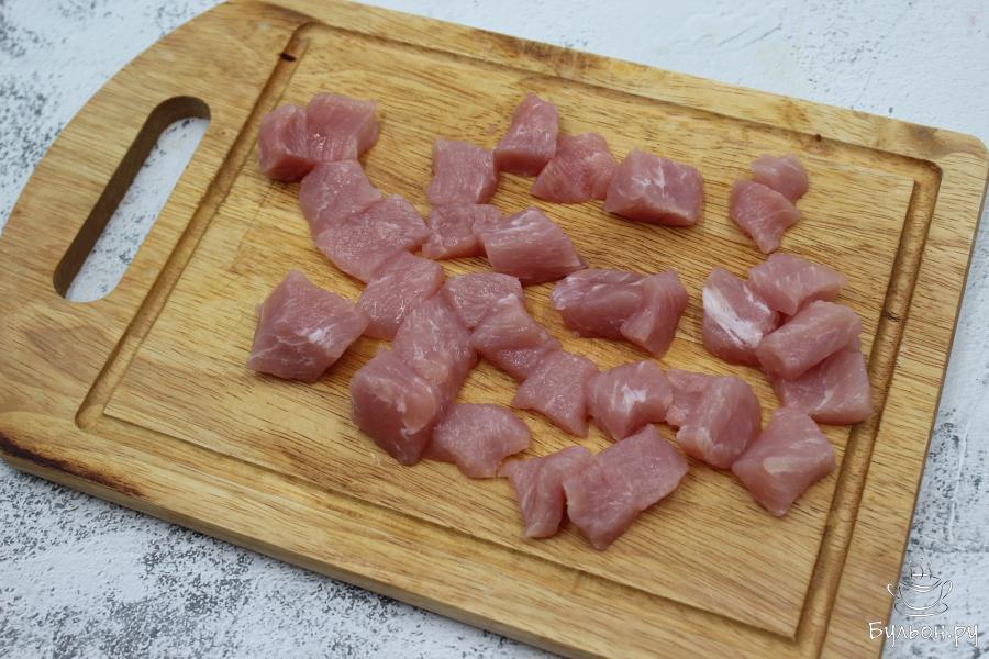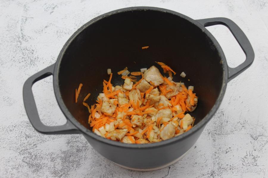 3. На растительном масле обжарить кусочки свинины. Добавить подготовленные овощи, посолить и еще жарить 5-7 минут. Затем закрыть казан крышкой и тушить около 20 минут, чтобы мясо стало мягче.
