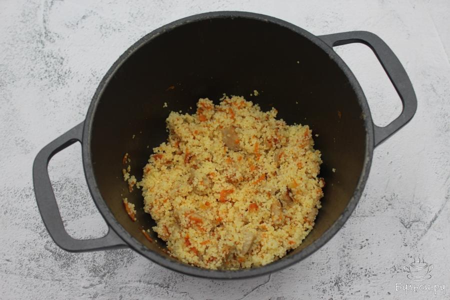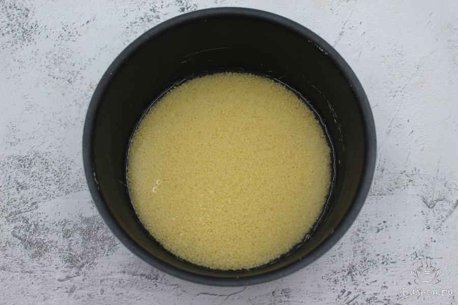 4. Кускус пересыпать в миску, добавить щепотку соли и залить кипятком. Запаривать крупу в течение 15 минут, она за это время должна разбухнуть и увеличится в объемах.