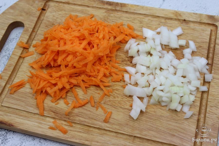 2. Очистить и промыть под водой лук и морковь. Лук нарезать небольшими кубиками, морковь натереть на крупной терке.