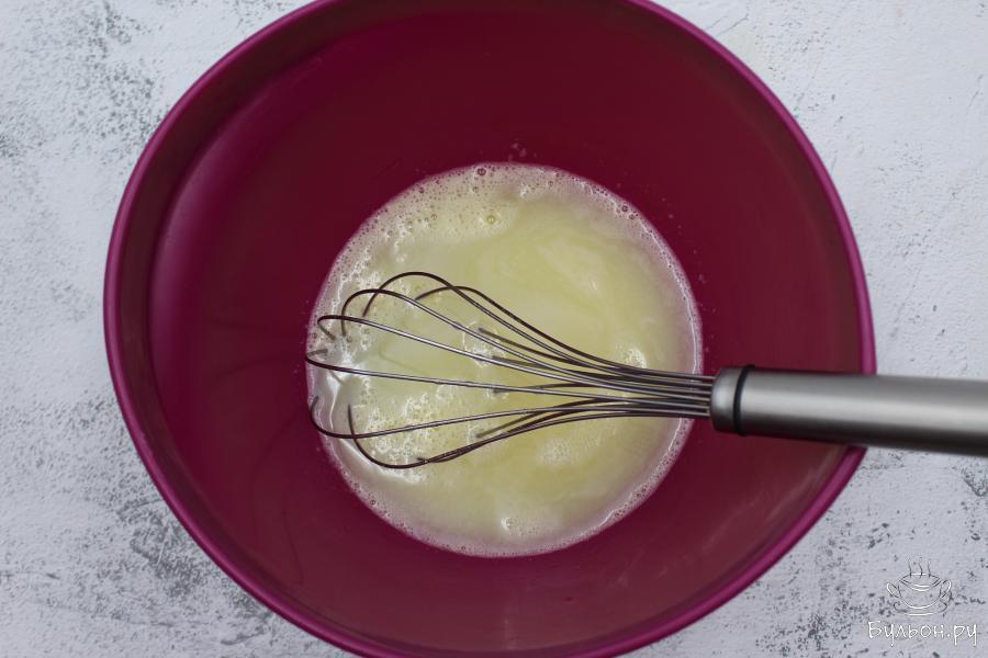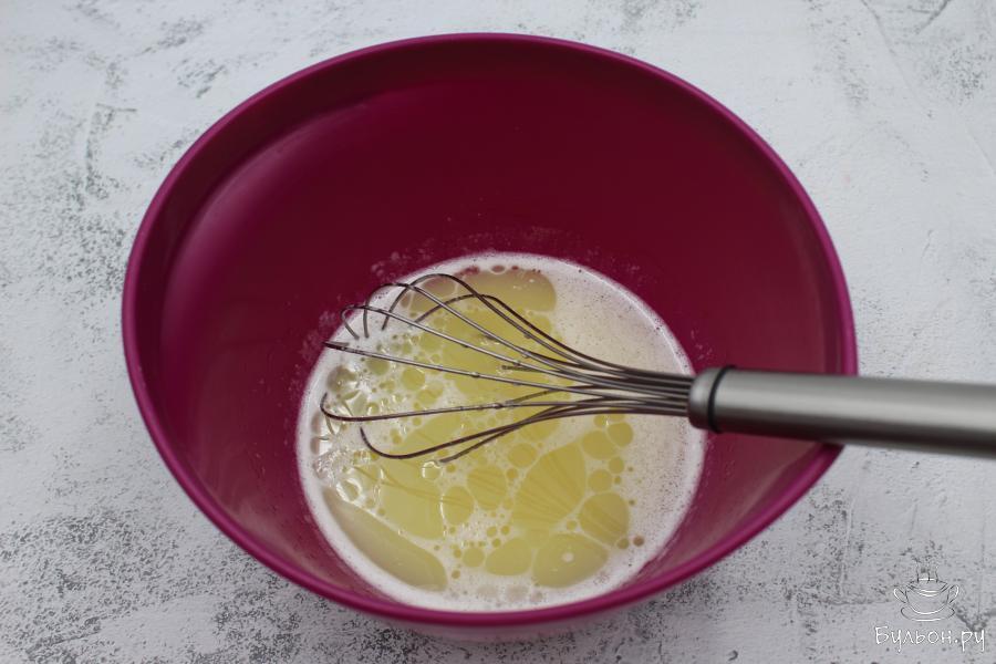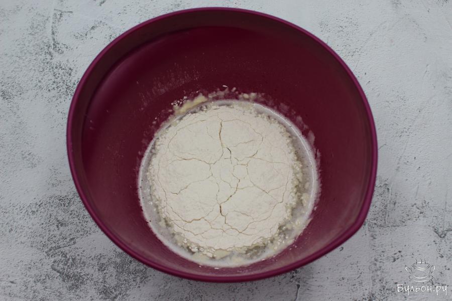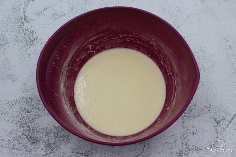 4. Частями ввести, в жидкую составляющую теста, просеянную через сито муку, каждый раз вымешивая тесто венчиком. Тесто должно получится достаточно жидким.