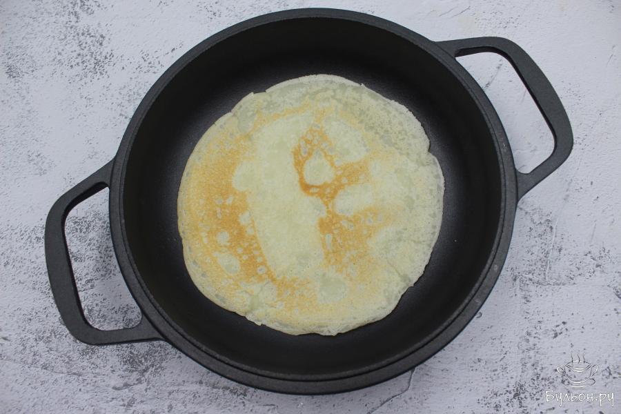 6. Только для первого блина смазать сковороду маслом, прогреть хорошо сковороду, затем влить тесто, равномерно распределите его по дну сковороды и дать блинчику пропечься.