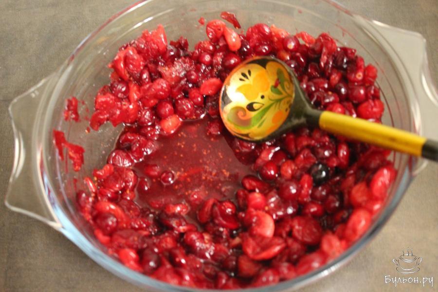 2. Используя деревянную ложку или деревянную толкушку, размять размороженные ягоды. Ягоды должны дать сок. Чем тщательнее размять ягоды, тем более витаминизированный получится морс.