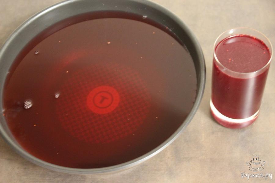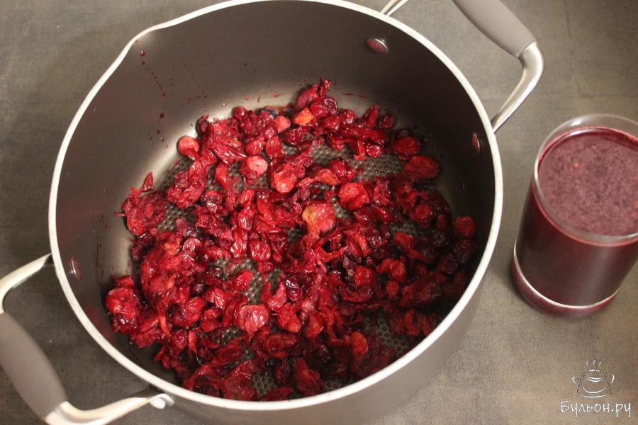 3. Ягодную массу процедить через марлю в стакан и отставить в сторону. Процеженный сок варить не будем, чтобы сохранить тот самый витамин С, который при нагревании частично разрушается. Ягодный жмых переложить в сотейник.