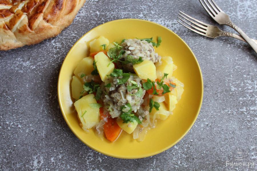 Жаркое с мясными тефтелями - это отличный вариант вкусного и сытного обеда или ужина. Жаркое получается насыщенное, ароматное, сочное и очень аппетитное. Такое жаркое можно дополнить своей любимой зеленью и другими душистыми пряностями. Если у вас для приготовления под рукой только рис твердых сортов, то его лучше заранее отварить до полуготовности. Если же вы хотите добавить в тефтели сырой рис, то лучше отдать предпочтение круглому рису.