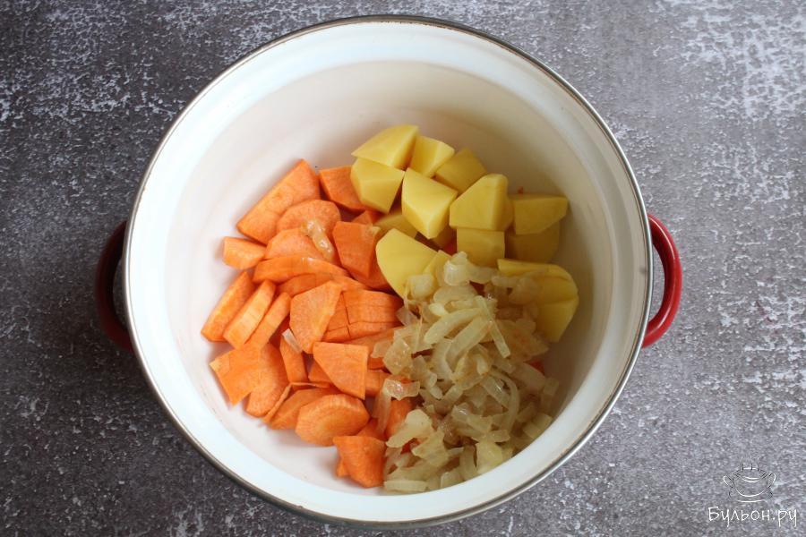6. Морковь и картофель почистить, промыть и нарезать крупными кусочками. Выложить в кастрюльку овощи и оставшийся обжаренный лук.