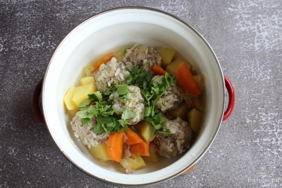 9. Кинзу промыть, мелко нарезать и добавить в жаркое. Накрыть крышкой и подержать жаркое на огне еще 2-3 минуты.