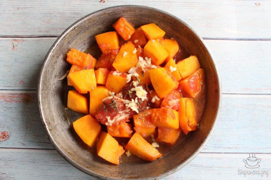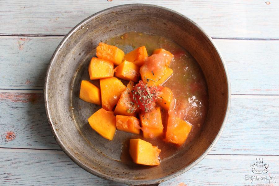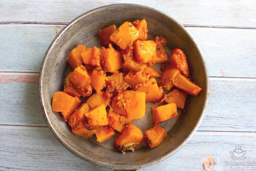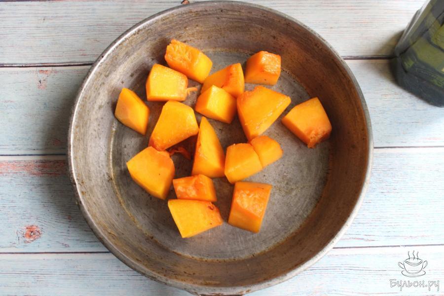 1. Тыкву почистить, нарезать крупными кубиками и обжарить на сковороде с разогретым маслом несколько минут до легкой корочки. Убрать сковороду с огня.