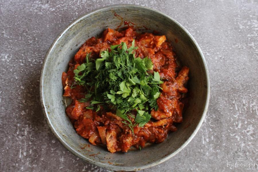 5. Зелень промыть, мелко нарезать и добавить в соус. Перемешать и через пару минут убрать сковороду с огня.