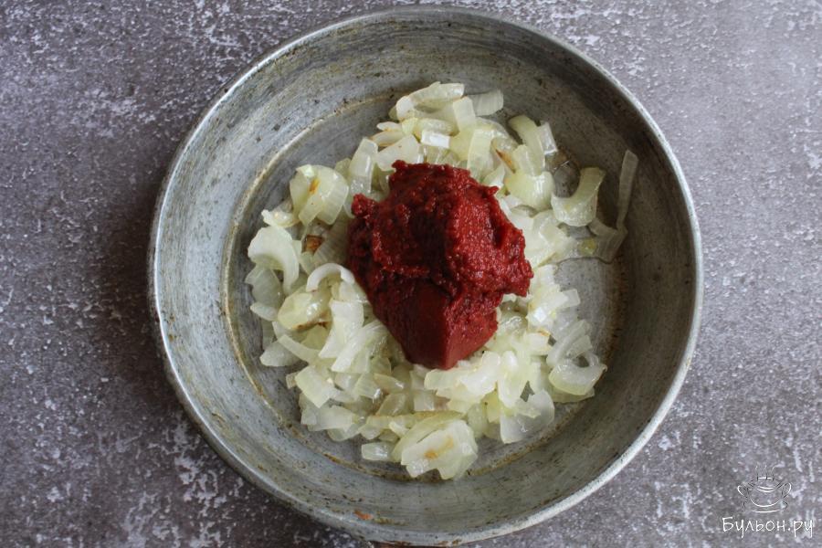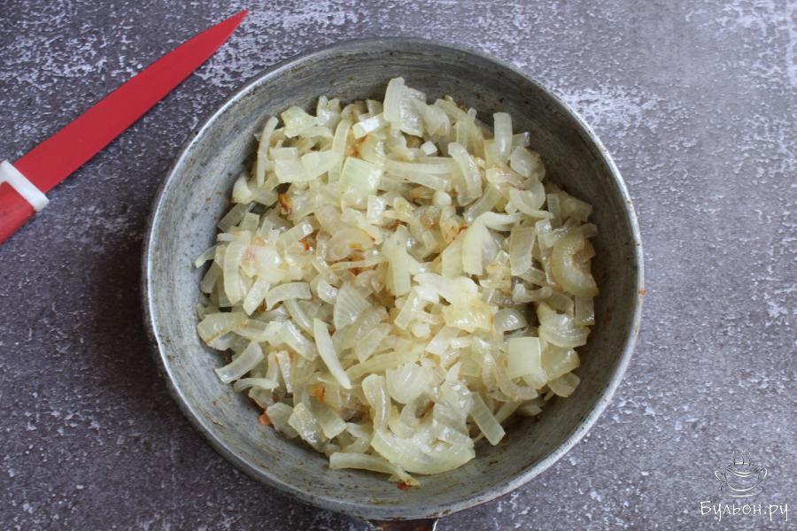 1. Лук почистить, промыть, нарезать не очень крупно. Обжарить лук в разоргетой сковороде, с маслом, 3-4 минуты до мягкости.
