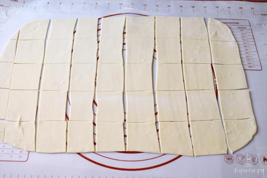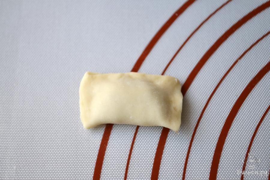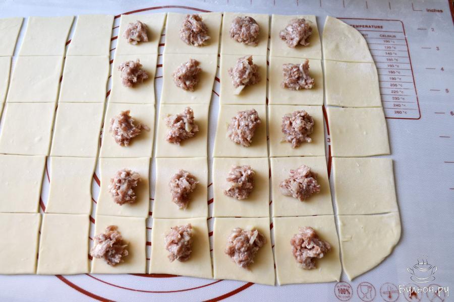 5. Замесить пельменное тесто из муки, яйца, соли и воды. Приготовленному тесту дать полчаса для отдыха под миской или пленкой. За это время клейковина набухнет и раскатывать тесто будет гораздо легче. Раскатать тесто в тонкий пласт, толщиной 1-2 мм, нарезать на квадратики со стороной 2-3 см.