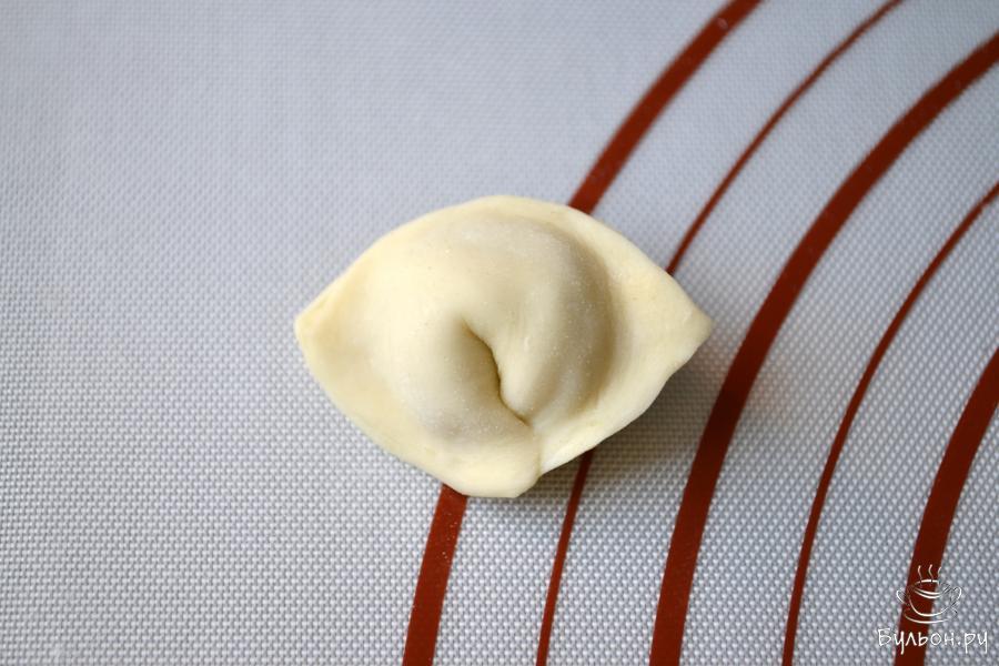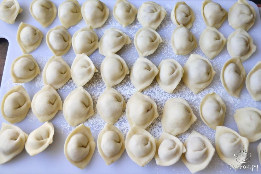 9. Слепить пельмени из всего фарша и теста. Складывать пельмени на доску, слегка посыпанную мукой. Доску с пельменями вынести на мороз для замораживания или поставить в морозильную камеру. Замороженные пельмени снять с доски и переложить в полиэтиленовый пакет для хранения.