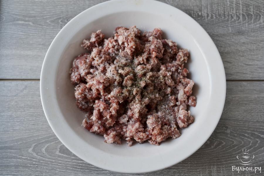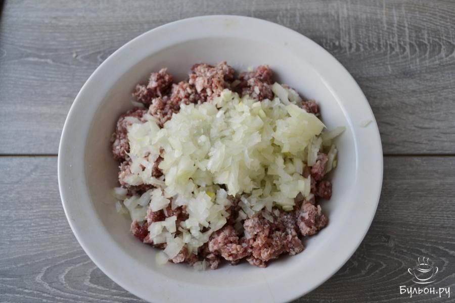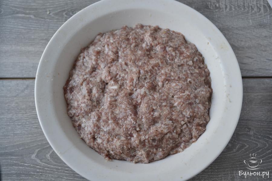 4. Тщательно перемешать фарш с луком. Если фарш очень густой, влить немного молока или воды, чтобы получить фарш нужной консистенции.