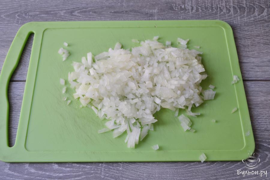 1. Для приготовления пельменного фарша, очистить и мелко нарезать одну крупную или две небольшие луковицы.