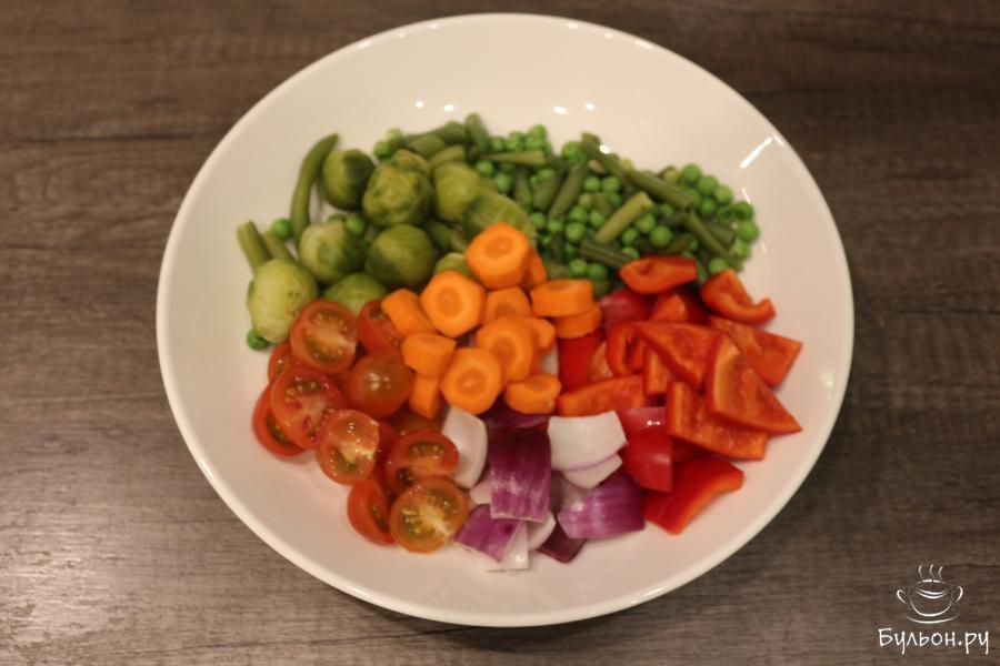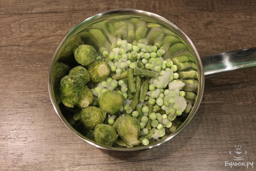 1. Брюссельскую капусту и стручковую фасоль выложить в кастрюлю, залить водой и поставить на огонь. Довести до кипения, проварить 3 минуты, после откинуть на дуршлаг.