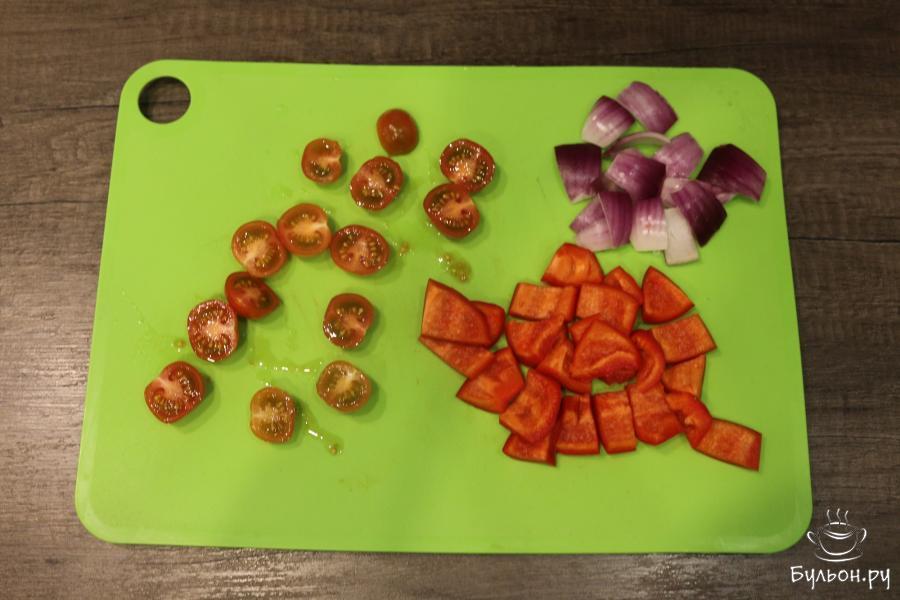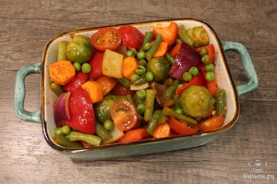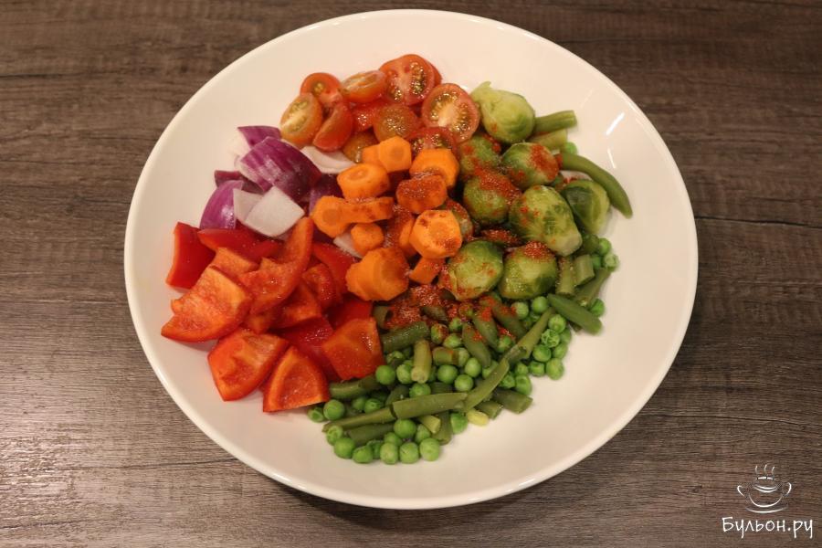 4. К овощам добавить соль и паприку. Влить пару ложек оливкового масла, все хорошо перемешать и выложить в форму для запекания.