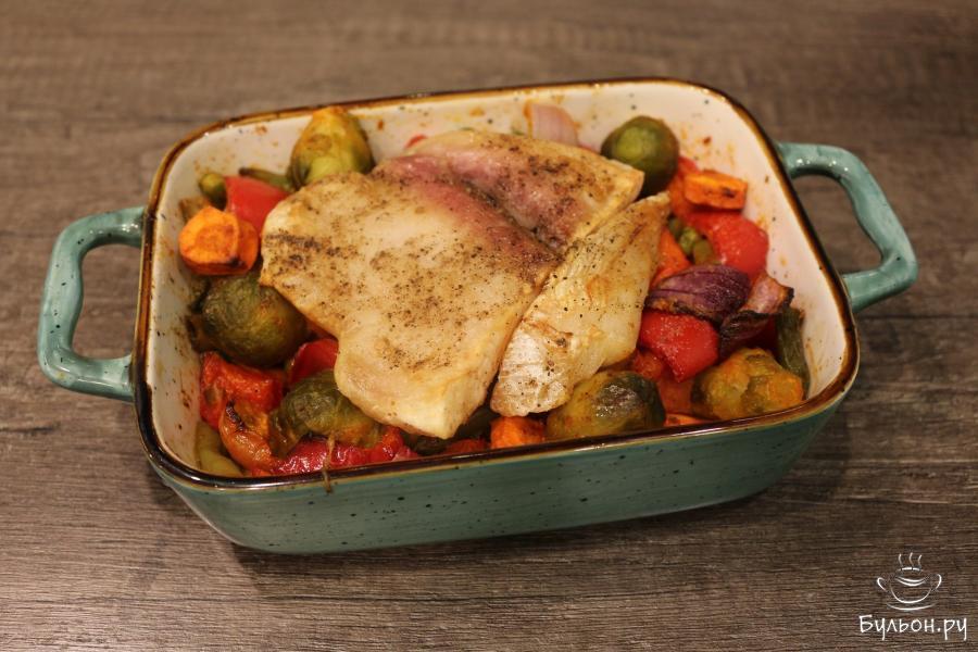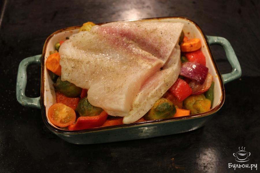 6. На овощи выложить вымытое под проточной водой и обсушенное бумажными полотенцами бескостное филе пангасиуса или любой другой белой рыбы. Посолить и поперчить по вкусу. Готовить в духовке еще 40 минут.