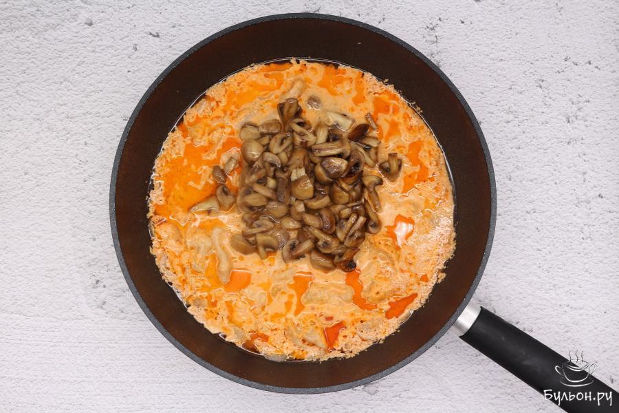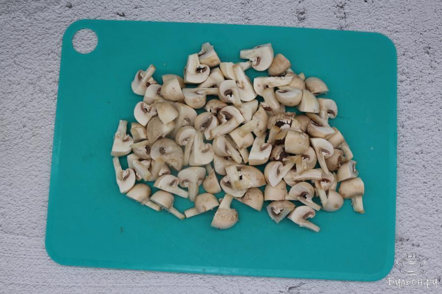 6. В это время вымыть шампиньоны и разрезать на 2-4 части. Обжарить их отдельно минут 5-7, также с небольшим количеством растительного масла.