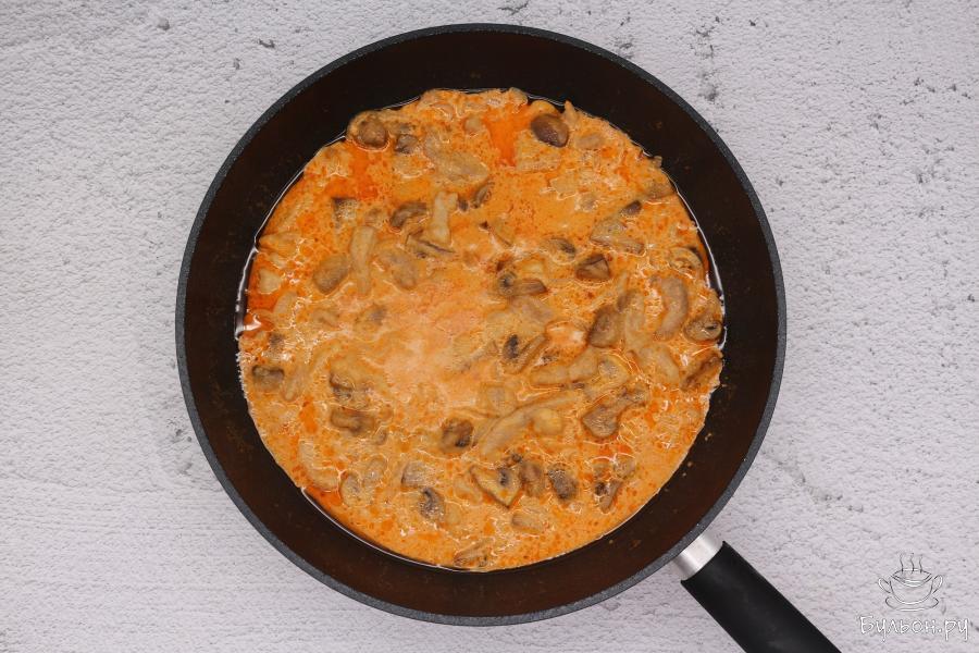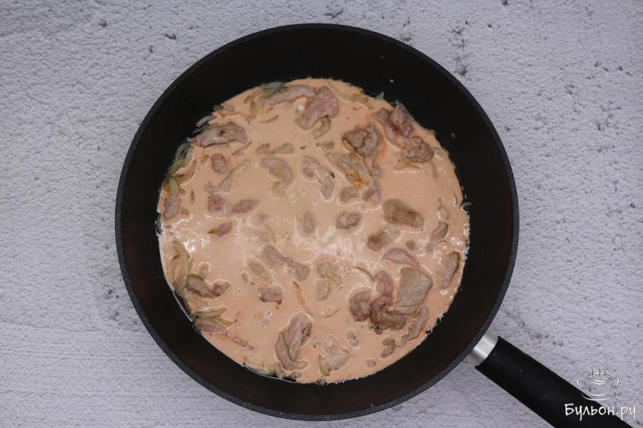 5. Как только мясо изменило цвет, влить сметанную заливку, добавить соль и перец, еще раз все перемешать и довести до кипения. Сразу сковороду накрыть крышкой и готовить так его еще около 40 минут.