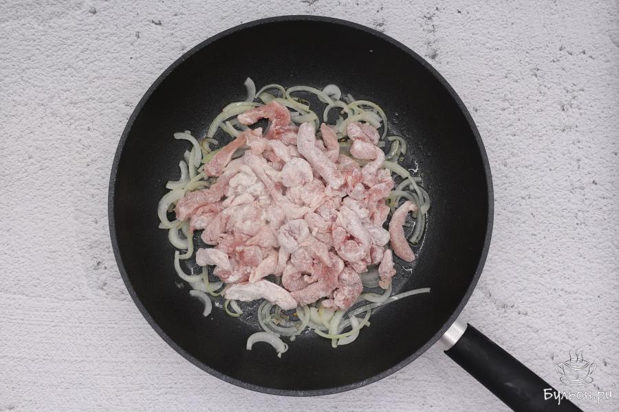 2. Очищенный лук нарезать полукольцами и обжарить его в небольшом количестве растительного масла в течение 2 минут, только доведя его до прозрачности.