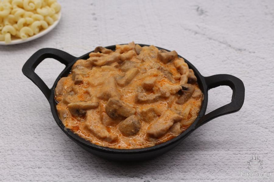 Бефстроганов из свинины с грибами со сметаной - это нежное, сливочное, ароматное мясное блюдо с шампиньонами, которое отлично сочетается с рисом и картофельным пюре. Также, в качестве гарнира можно подать макаронные изделия, кускус, гречку, вареный картофель и другие виды гарниров. Блюдо с гарниром не получится сухим, так как мясо приготовлено в достаточном количестве соуса. В данном варианте блюдо приготовлено со свининой, но оно также получается вкусным и с говядиной, и с курицей, выбирайте на свой вкус.